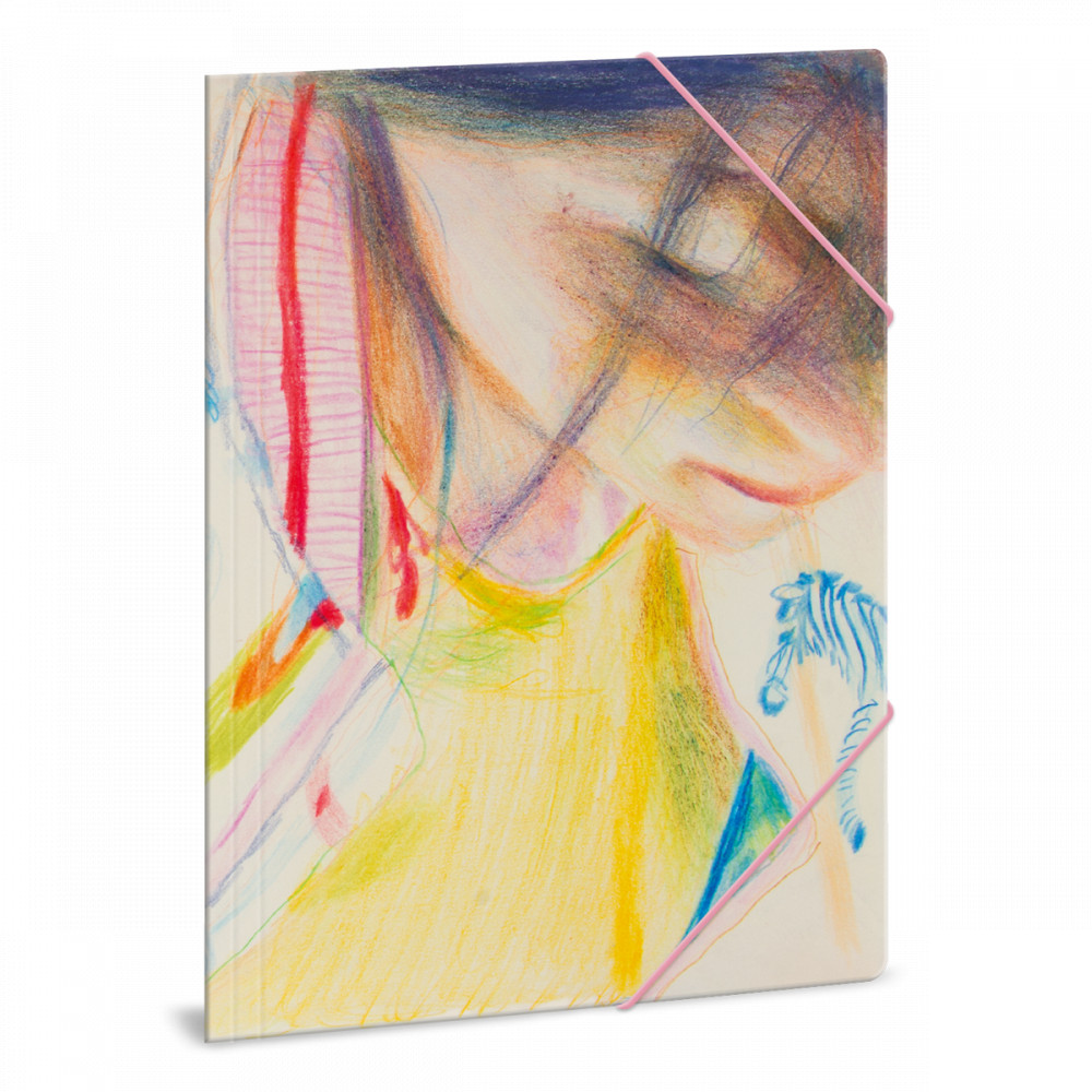 Vetlényi Zsolt festőművész grafikájával ellátott A/4 méretű gumis dosszié iratok, füzetek tárolására. 350 gr-os vastag kartonból készült dosszié lekerekített első sarkokkal, színes gumi zárópánttal. Külseje négy színnel, fényes fóliával nyomott. Belső oldala nyomatlan.