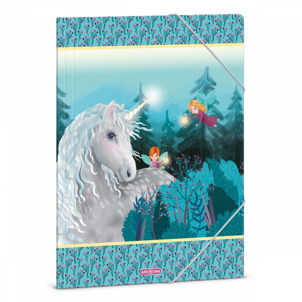 A/4 méretű gumis dosszié iratok, füzetek tárolására. 350 gr-os vastag kartonból készült dosszié lekerekített első sarkokkal, színes gumi zárópánttal. Külseje négy színnel, fényes fóliával nyomott. Belső oldala nyomatlan.