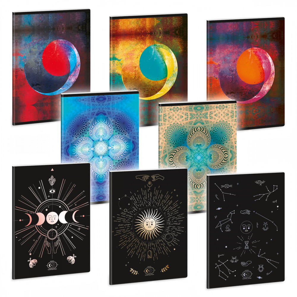 A/5-ös méretű, prémium minőségű sima füzet. 40 lapos, belseje 75 gr-os, fehér papírból. Borítója lekerekített sarkokkal, 300 gr-os fényes műnyomó kartonra, 4 szín nyomással, matt fóliával, UV formalakkal készült. Különböző mintájú füzetek a 10-es fólia csomagon belül vegyesen csomagolva, a füzeteknek megegyezik a kódja.