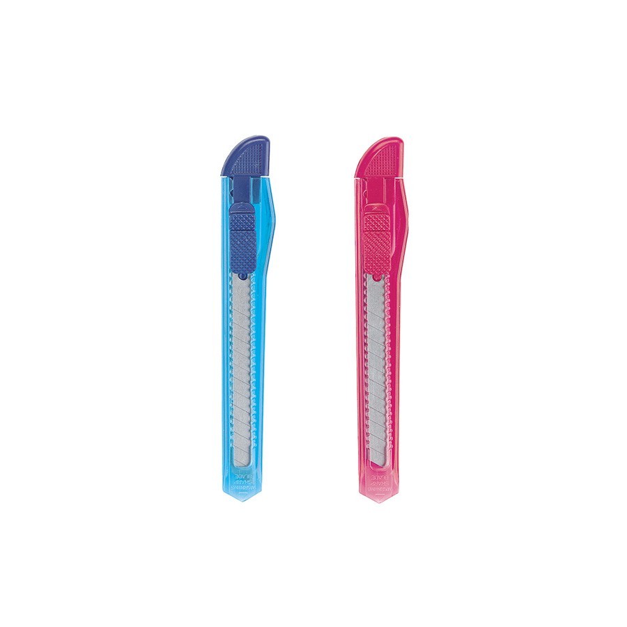 Barkácskés, áttetsző műanyag testtel, visszahúzható acél pengével.