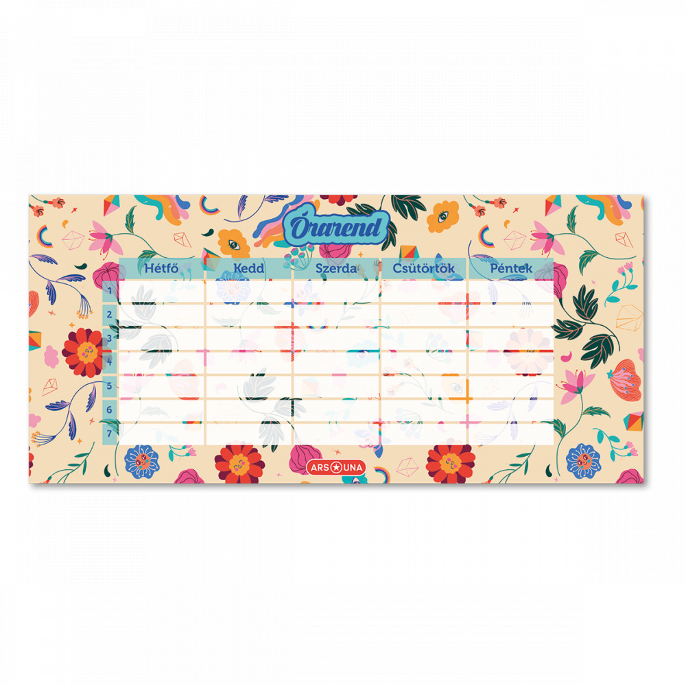 Kétoldalas, magyar nyelvű órarend A és B hét beosztással. 250 gr-os félfényes műnyomó papírra, 4 szín nyomással nyomott.