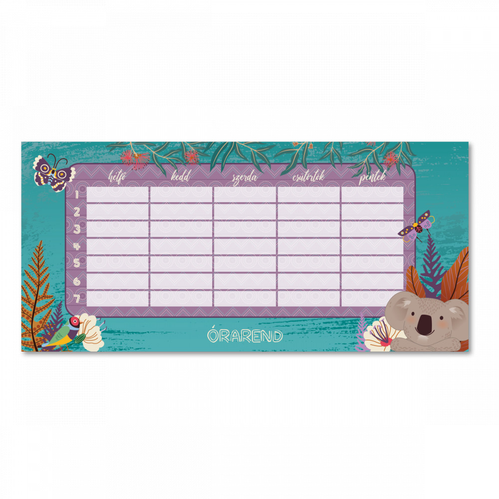 Kétoldalas, magyar nyelvű órarend A és B hét beosztással. 250 gr-os félfényes műnyomó papírra, 4 szín nyomással nyomott.