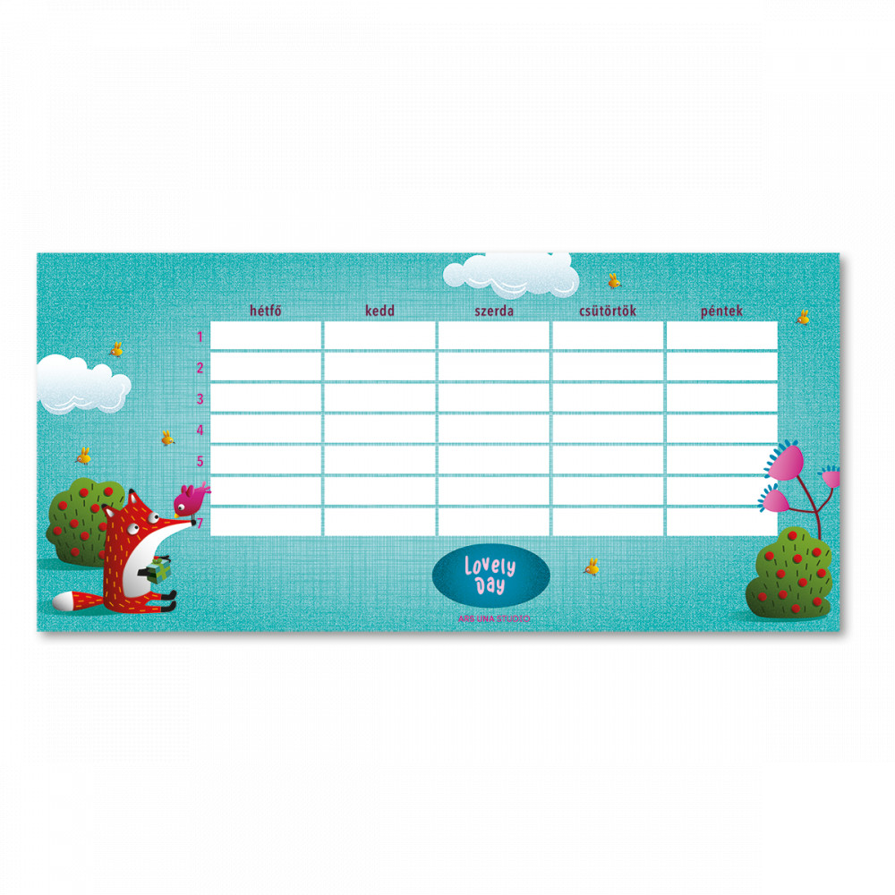 Kétoldalas, magyar nyelvű órarend A és B hét beosztással. 250 gr-os félfényes műnyomó papírra, 4 szín nyomással nyomott.