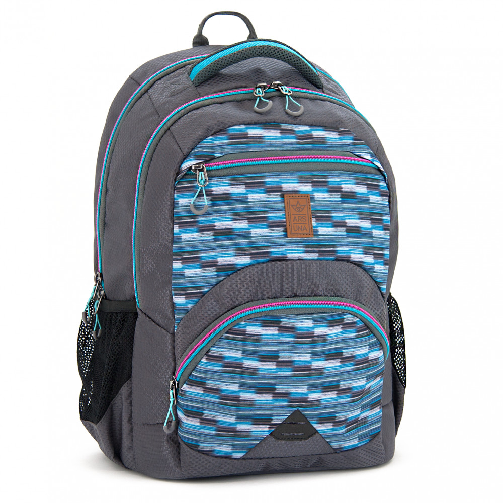 Ergonomikus hátizsák, amelyet 3. osztálytól ajánlunk. Szellőztető hátkiképzéssel (Air Flow Max System), állítható mellkaspánttal és párnázott, állítható vállpántokkal, tetején két fogantyúval, vízlepergető anyagból. A hátizsák hátsó része, belső részén alul az oldalsó rész és az alj is párnázott, ezáltal a táska formatartó, de nem merev. 1 nagy rekesszel, párnázott laptop tartóval, kétoldalt hálós zsebbel a kulacs részére. Középső rekeszében cipzáras belső zseb + 2 zseb, valamint 3 db cipzáras első zseb található. Mérete: 450 x 330 x 200 mm. Űrtartalma: 21 l. Terhelhetőség: 10 kg. 2 év garancia.