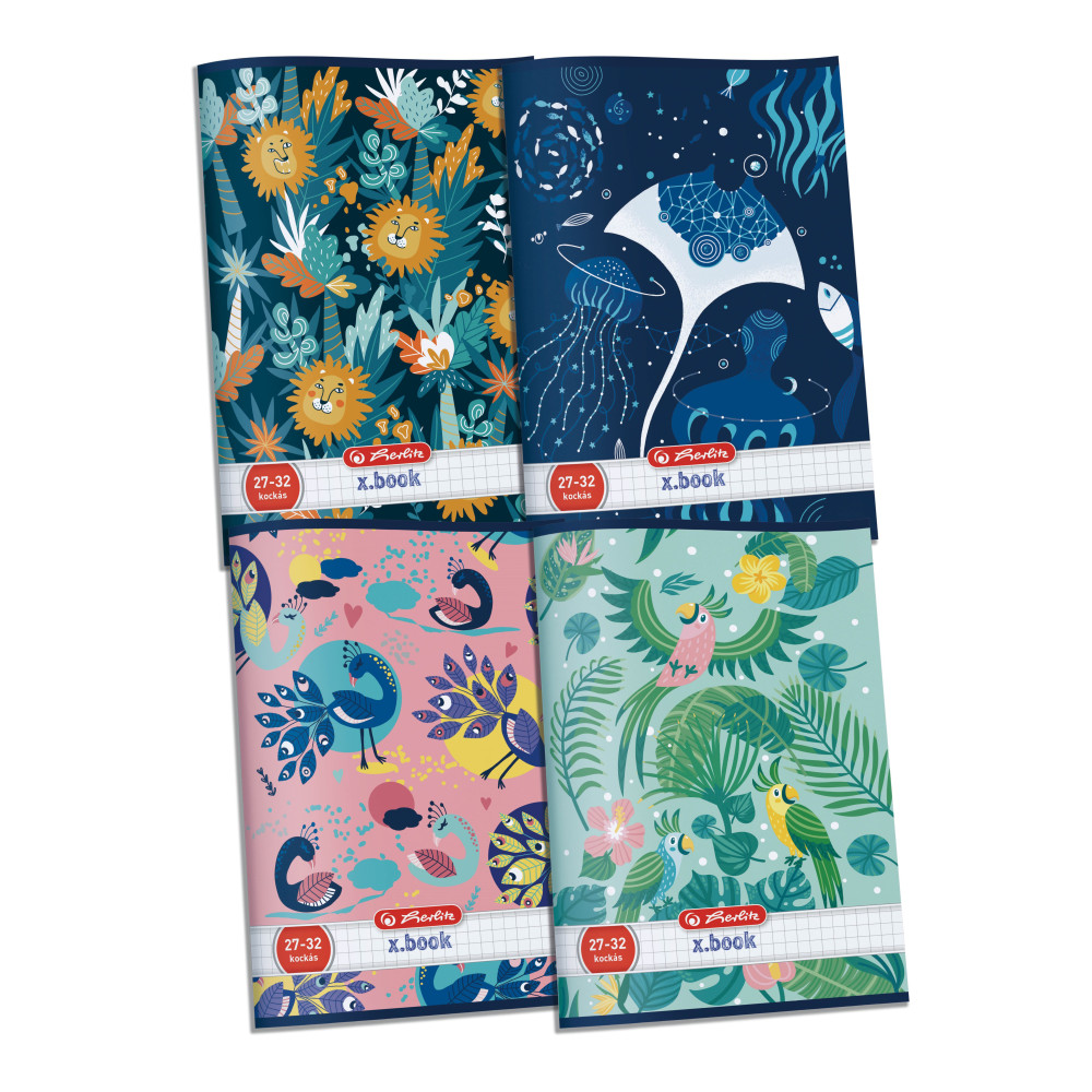 A5-ös méretű, 32 lapos, kockás iskolai füzet Girls, kapcsozott kivitelben, mintás fedlappal, hófehér belívvel, margóval, az x.book termékcsalád része, 4 mintával.