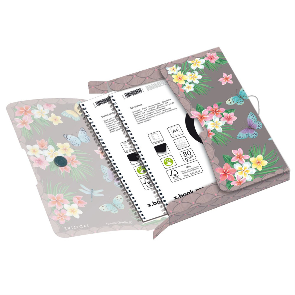 A4-es méretű iratok tárolására alkalmas füzetbox Ladylike Butterflies, feliratozható 4 cm-es gerincvastagsággal, PP alapanyagból, az easy.orga to go termékcsalád tagja.