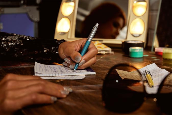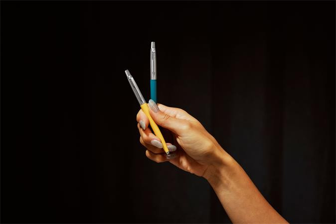 Golyóstoll szett, 0,7 mm, ezüst színű klip, kék és sárga tolltest, PARKER "Jotter Glam Rock", kék