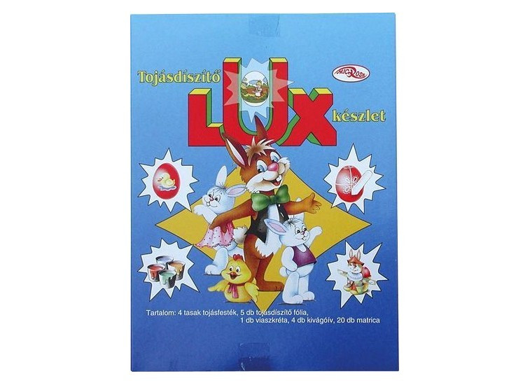 Húsvéti tojásdíszítő készlet LUX, a készlet tartalma: 4 színű tojásfesték, díszítőfólia, viaszfesték, kivágóív, matrica
