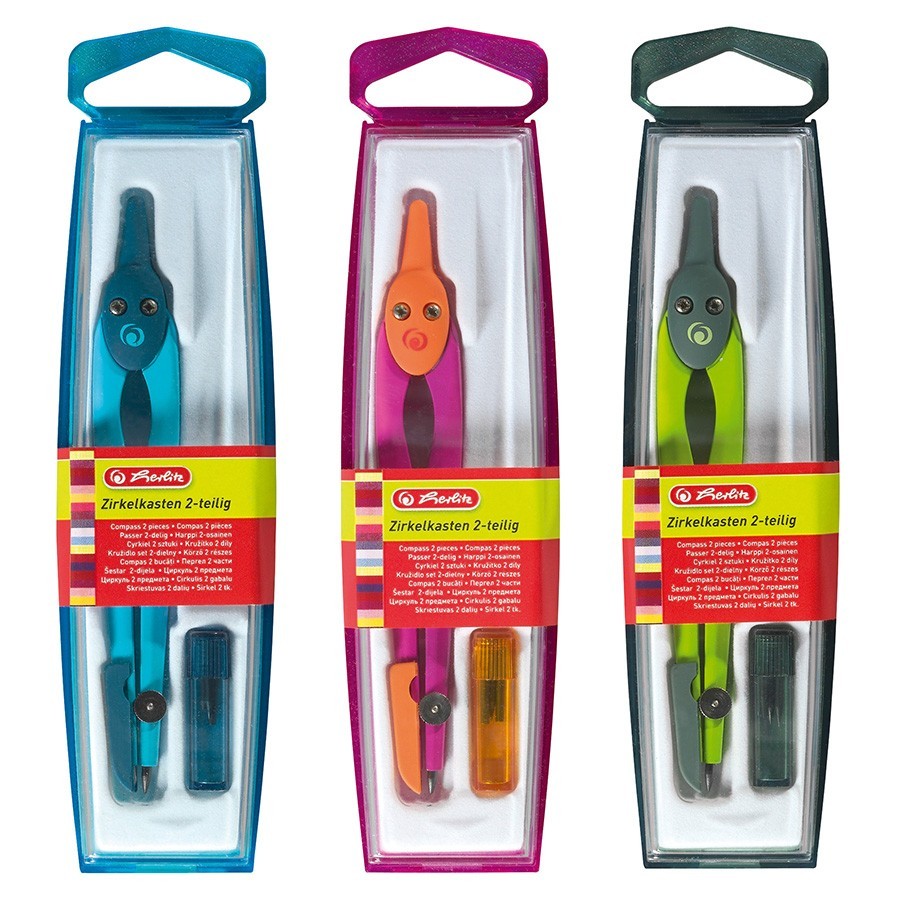 Iskolai körző, többszínű, pótheggyel, hegyvédővel.