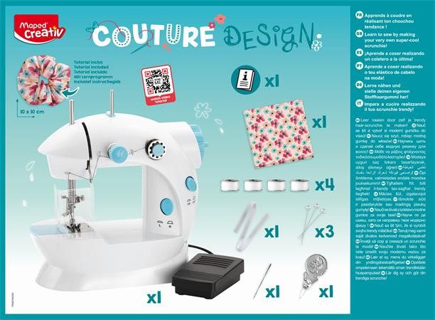 Pedálos varrógép a szükséges készlettel együtt, egy divatos hajgumi készítéséhez.