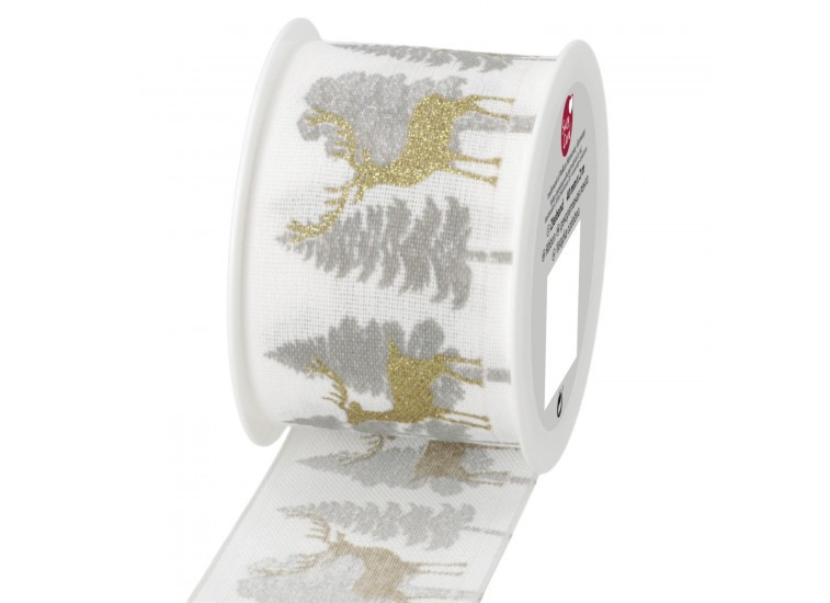 Karácsonyi textilszalag Szarvas, fehér alapon arany szarvas és ezüst erdő motívummal, 2m x 40mm.