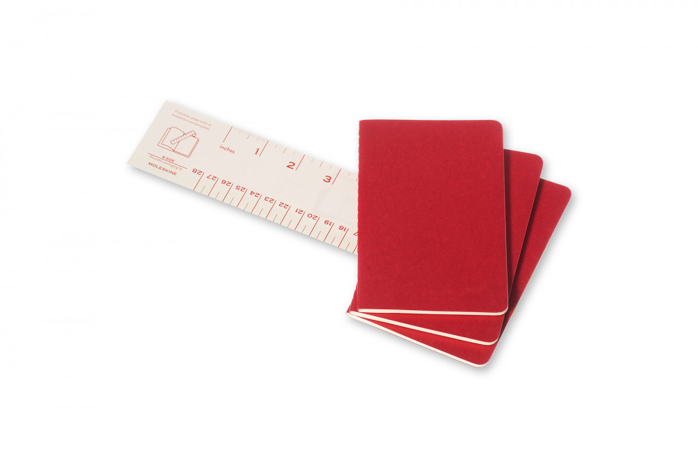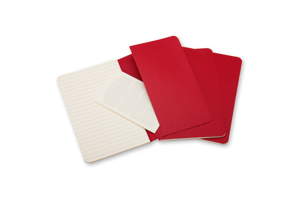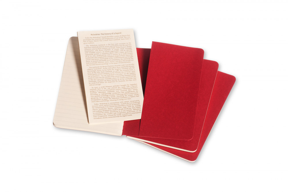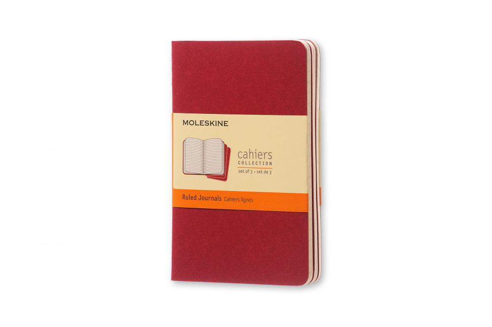 A Moleskine Cahier füzetei rugalmas, strapabíró füzetek kartonfedéllel, gerincvarrással, savmentes lapokkal, vonalas belívvel. Az utolsó 16 oldal perforált, letéphető. A jegyzetek elhelyezésére a borítón belül egy kis zseb áll rendelkezésre. Minden háromdarabos csomagolás tartalmazza a Moleskine történetét is.