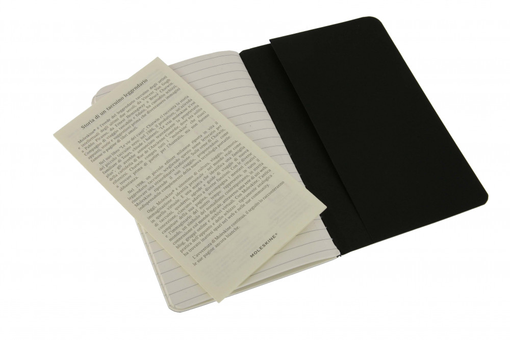 A Moleskine Cahier füzetei rugalmas, strapabíró füzetek kartonfedéllel, gerincvarrással, savmentes lapokkal, vonalas belívvel. Az utolsó 16 oldal perforált, letéphető. A jegyzetek elhelyezésére a borítón belül egy kis zseb áll rendelkezésre. Minden háromdarabos csomagolás tartalmazza a Moleskine történetét is.