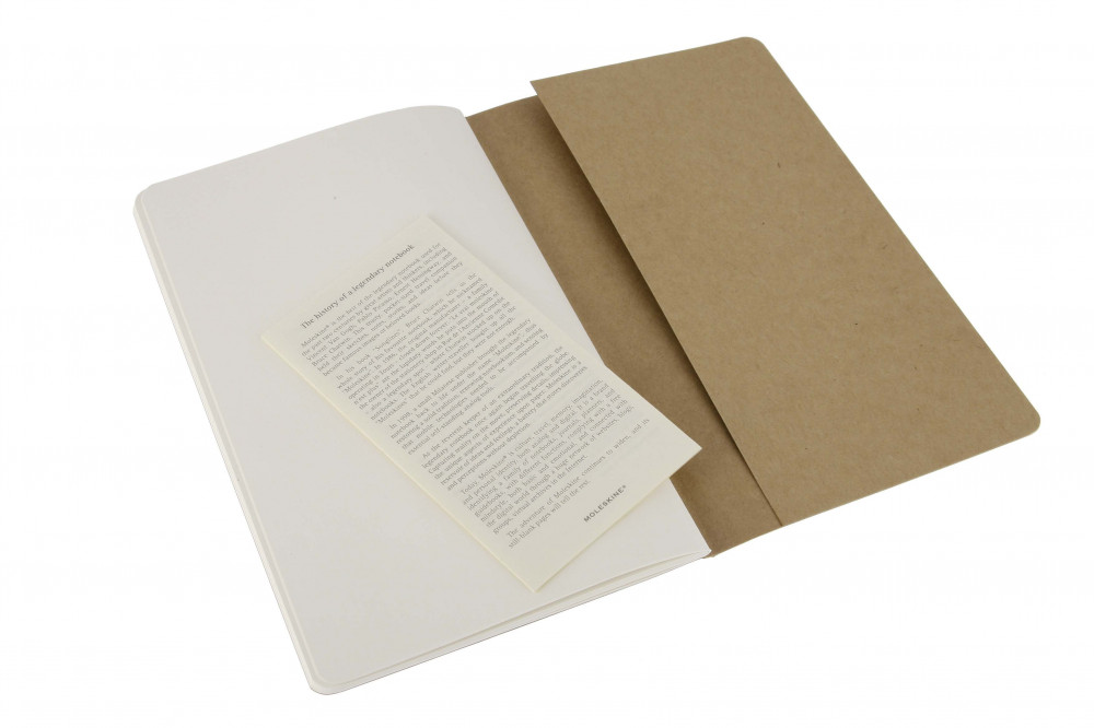 A Moleskine Cahier füzetei rugalmas, strapabíró füzetek kartonfedéllel, gerincvarrással, savmentes lapokkal, sima belívvel. Az utolsó 16 oldal perforált, letéphető. A jegyzetek elhelyezésére a borítón belül egy kis zseb áll rendelkezésre. Minden háromdarabos csomagolás tartalmazza a Moleskine történetét is.