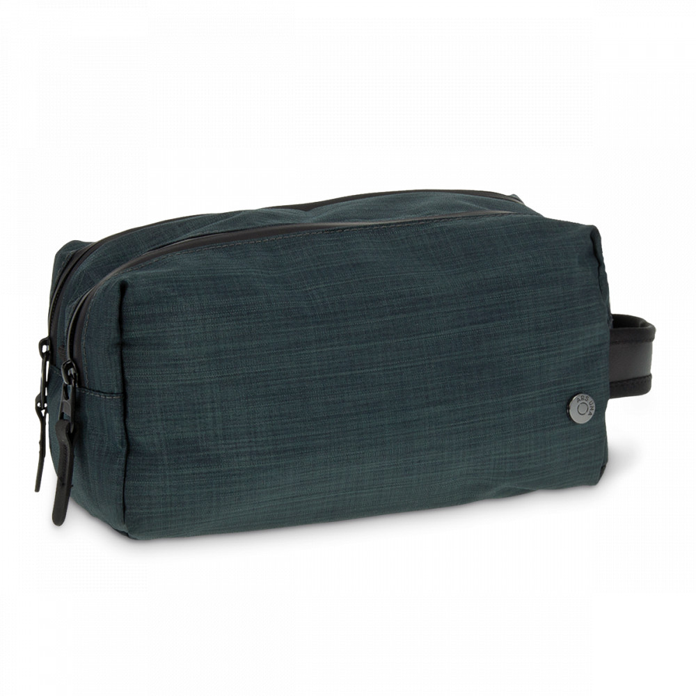 Vízlepergető anyagból készült, nagyméretű neszeszer. Két cipzáras rekesszel, egyik rekeszen belül kis cipzáras zseb is található.
