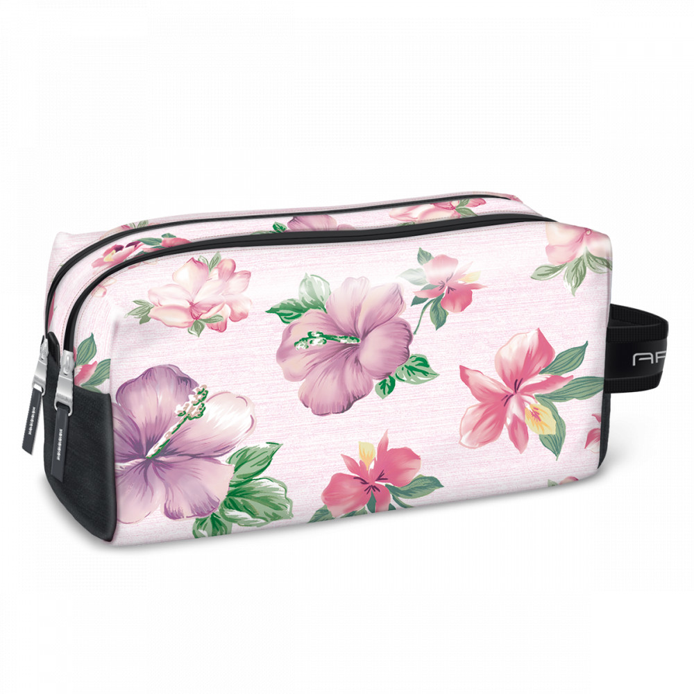 Vízlepergető anyagból készült, nagyméretű neszeszer. Két cipzáras rekesszel, egyik rekeszen belül kis cipzáras zseb is található.