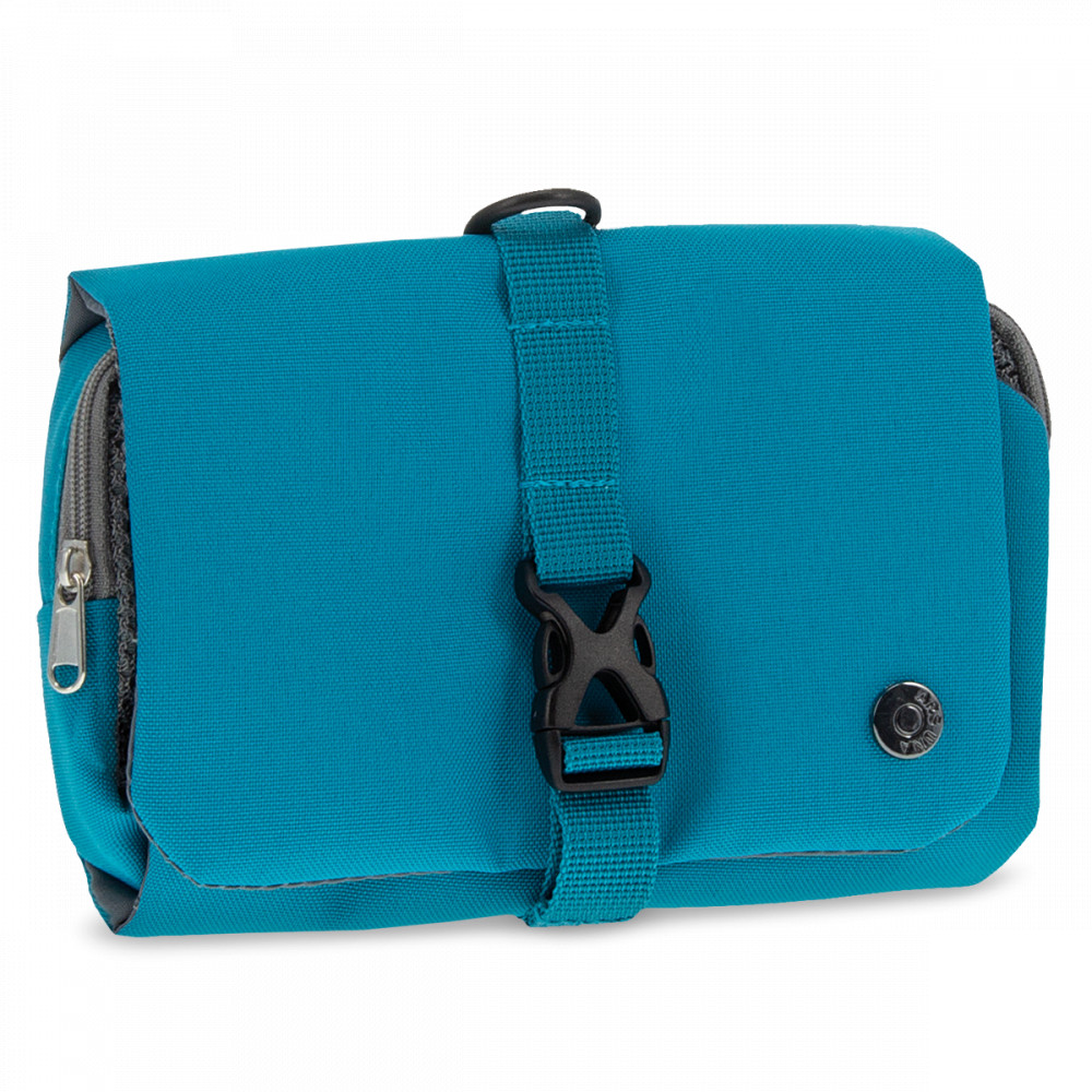 Vízlepergető anyagból készült, összehajtható neszeszer, műanyag akasztóval. Műanyag csattal nyitható-zárható - a csat pántja szabályozható. Három cipzáras rekesszel, melyből a középső rekesz külön is használható.