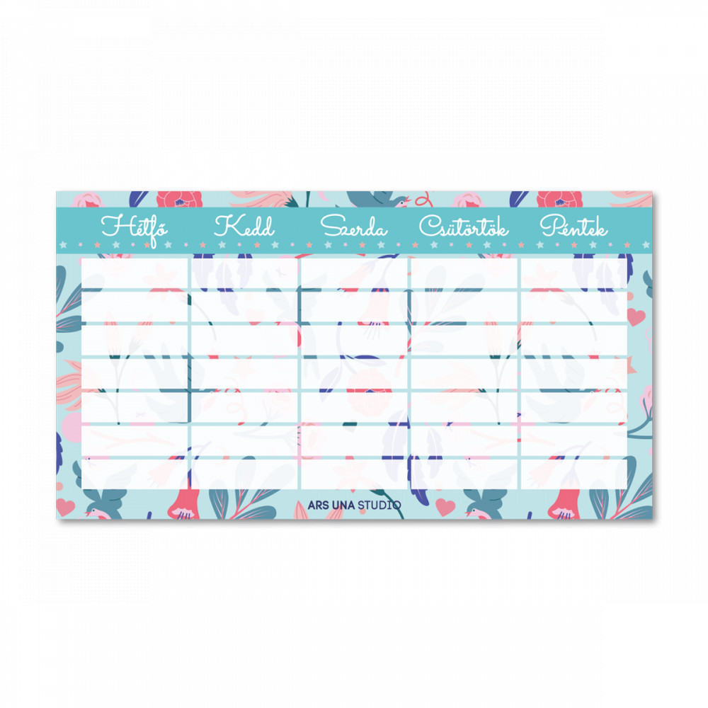 Kétoldalas, magyar nyelvű órarend A és B hét beosztással. 250 gr-os félfényes műnyomó papírra, 4 szín nyomással nyomott. Kis méretének köszönhetően illeszkedik az ARS UNA töltött tolltartókba és iskolatáskákba.