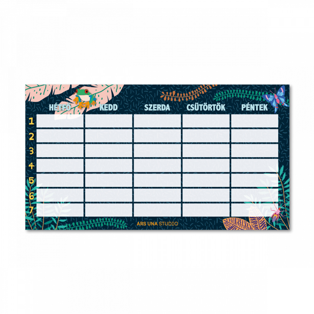 Kétoldalas, magyar nyelvű órarend A és B hét beosztással. 250 gr-os félfényes műnyomó papírra, 4 szín nyomással nyomott. Kis méretének köszönhetően illeszkedik az ARS UNA töltött tolltartókba és iskolatáskákba.