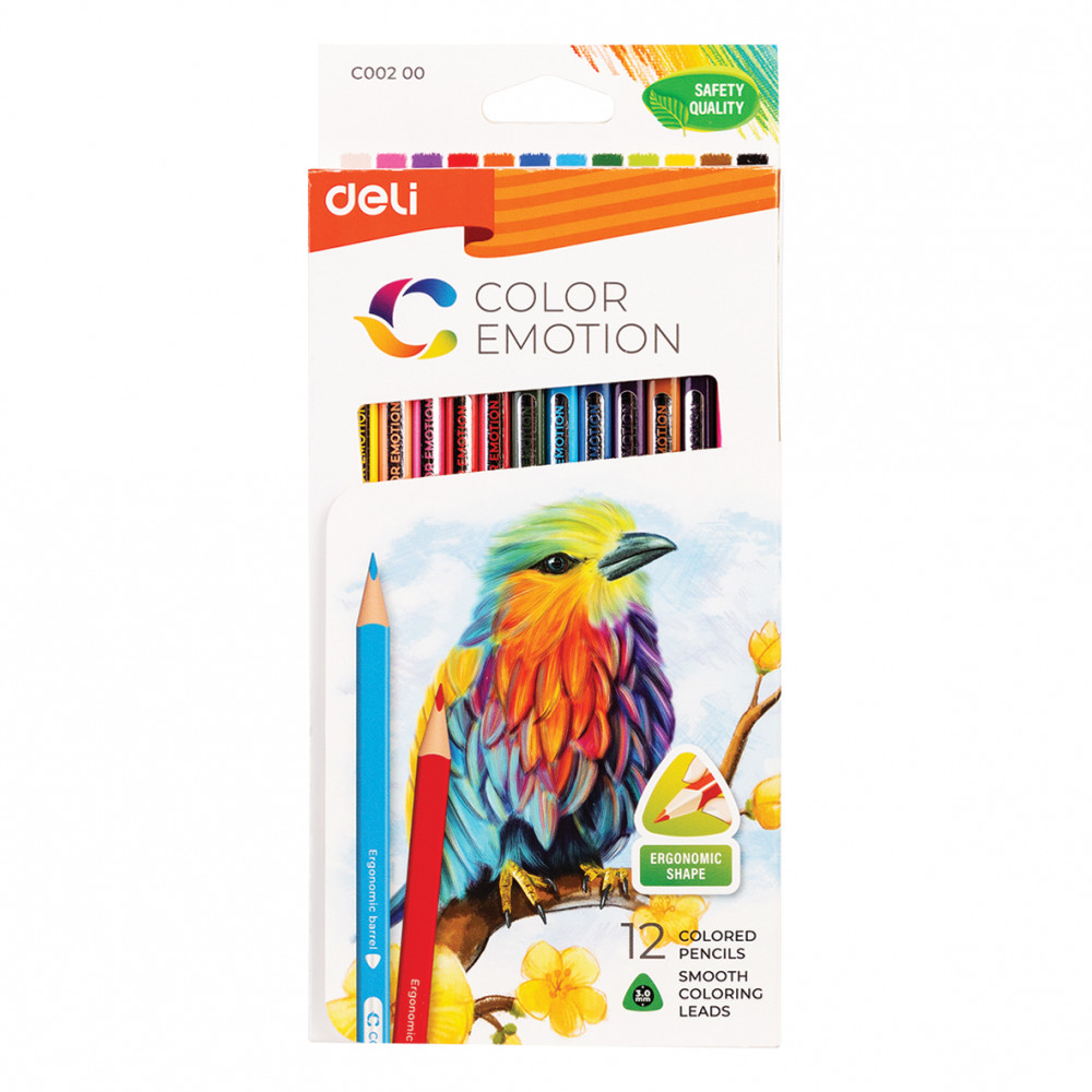 Színes ceruzakészlet, háromszögletű, papírdobozos, DELI "Color Emotion", 12 különböző szín (DEC00200)