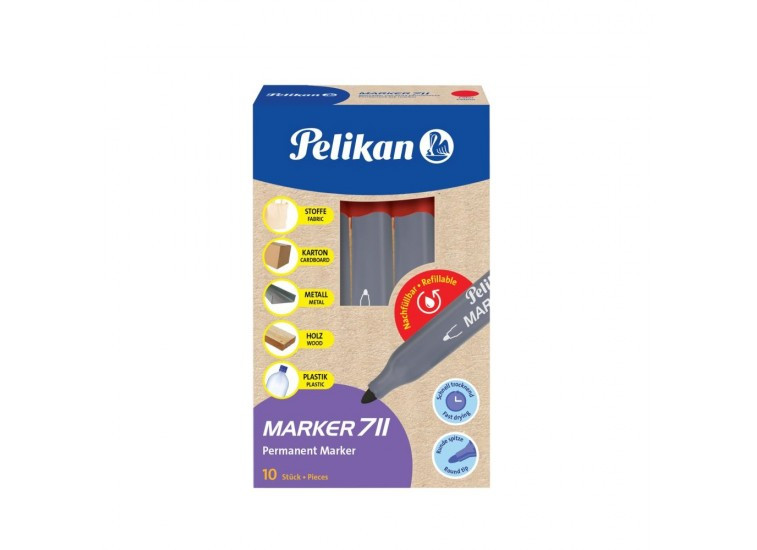 Pelikan 711-es piros színű jelölőfilc, lekerekített heggyel, henger testtel, vízálló, permanens. Szinte minden felületre ír (fa, fém, műanyag, üveg), 10 db/doboz.