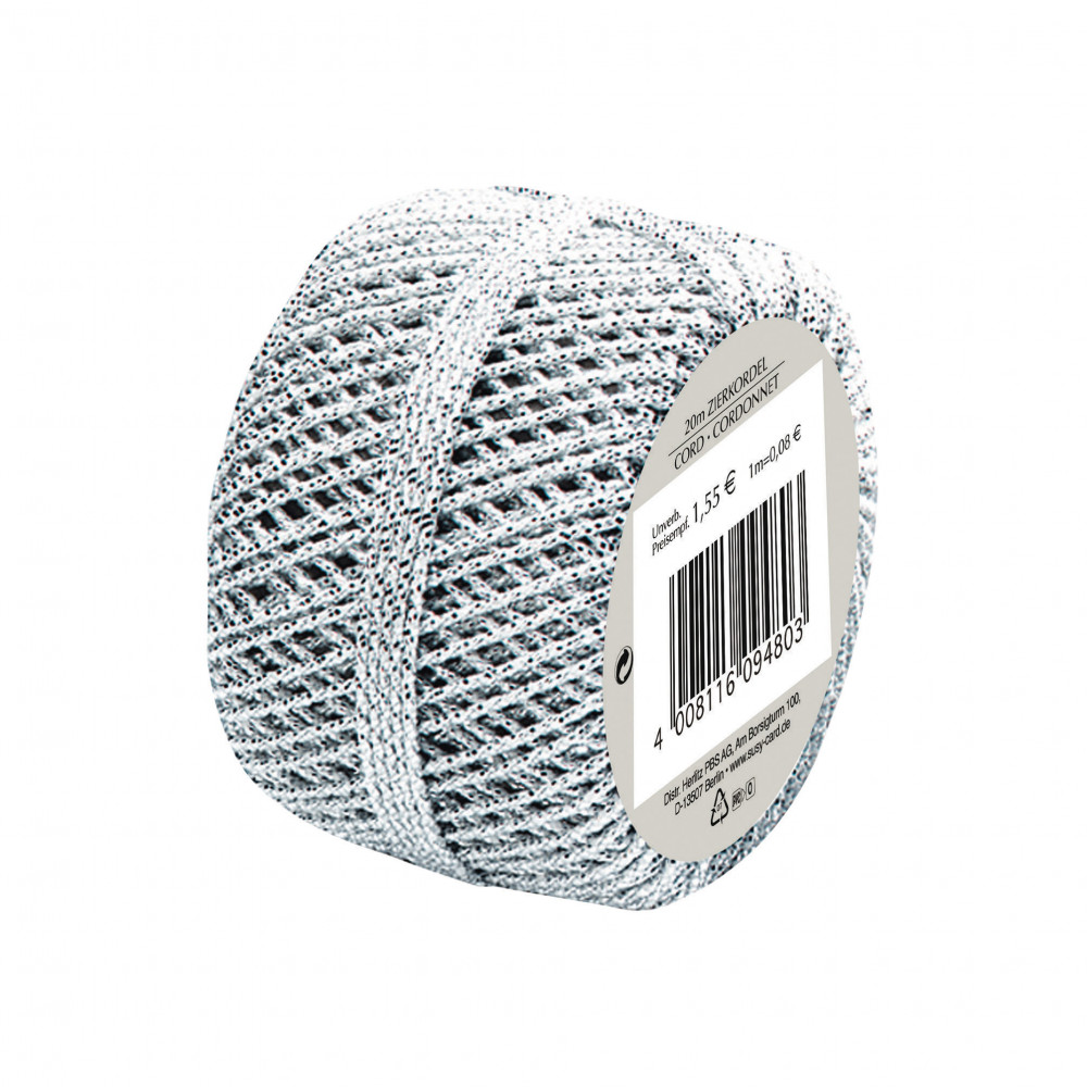 Díszzsinór, 20 méter hosszú, ezüst.