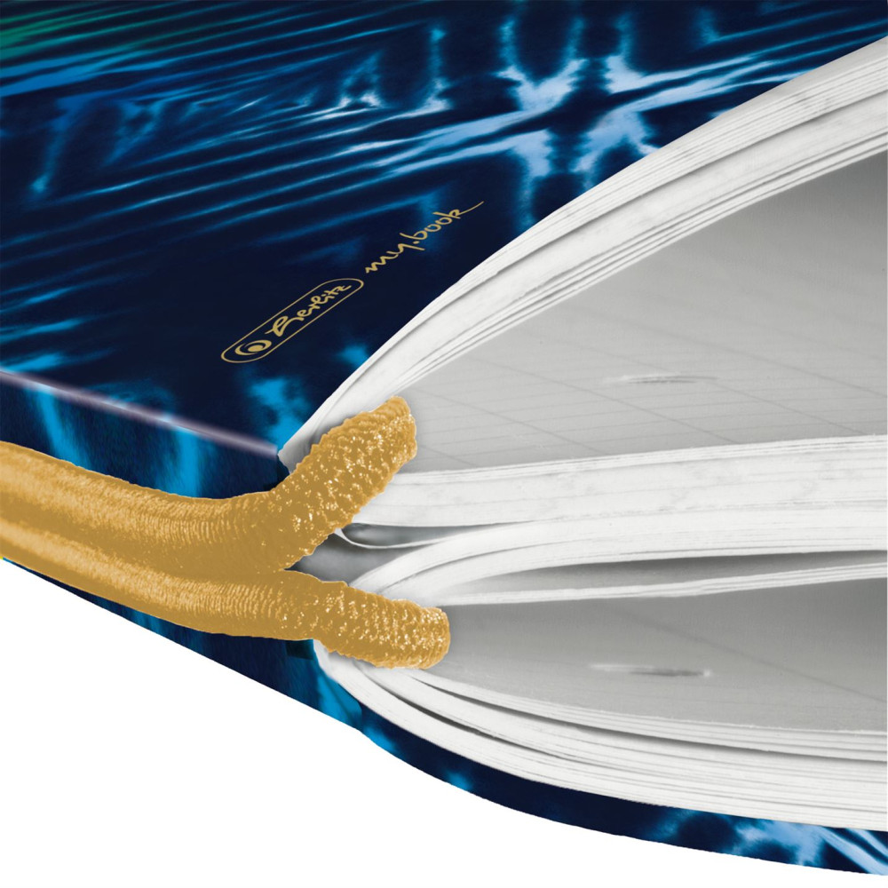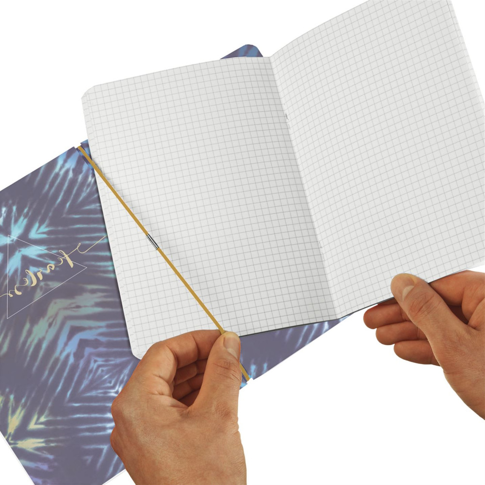 my.book flex füzet Batik Fearless, A4-es méretben, 80g/m2 famentes belívvel, hófehér lapokkal, 40 kockás + 40 vonalas lyukasztott és perforált lappal, lekerekített sarkokkal, hosszanti irányban gumiszalaggal záródik, PP fedlappal.
