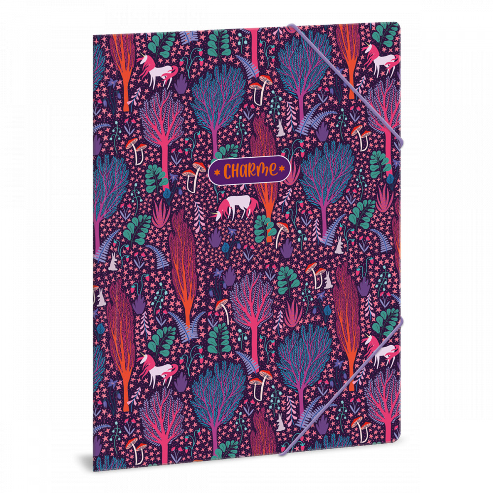 A/4 méretű gumis dosszié iratok, füzetek tárolására. 350 gr-os vastag kartonból készült dosszié lekerekített első sarkokkal, színes gumi zárópánttal. Külseje négy színnel, fényes fóliával nyomott. Belső oldala nyomatlan.