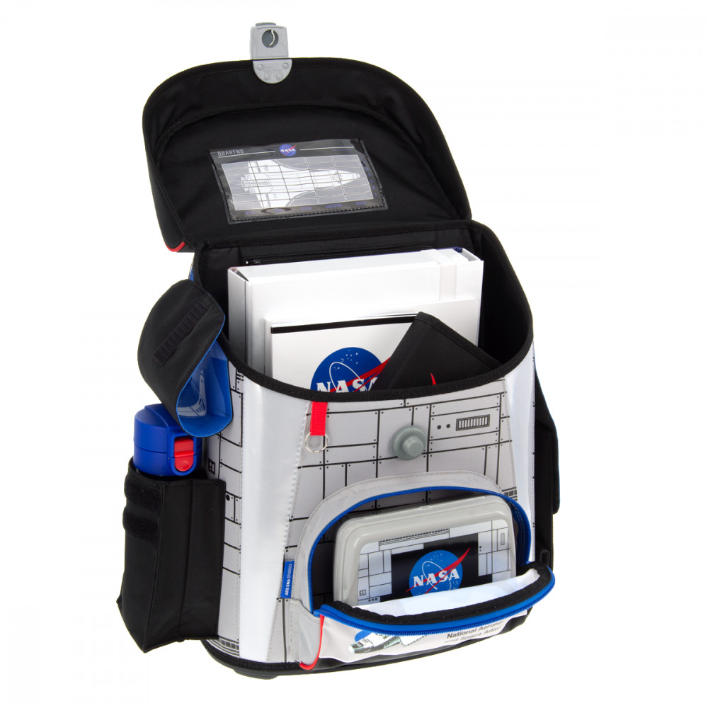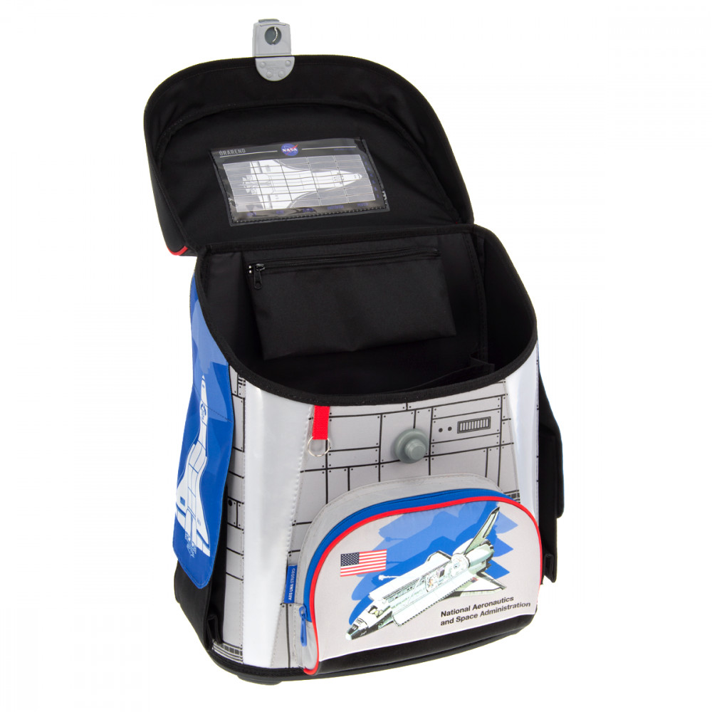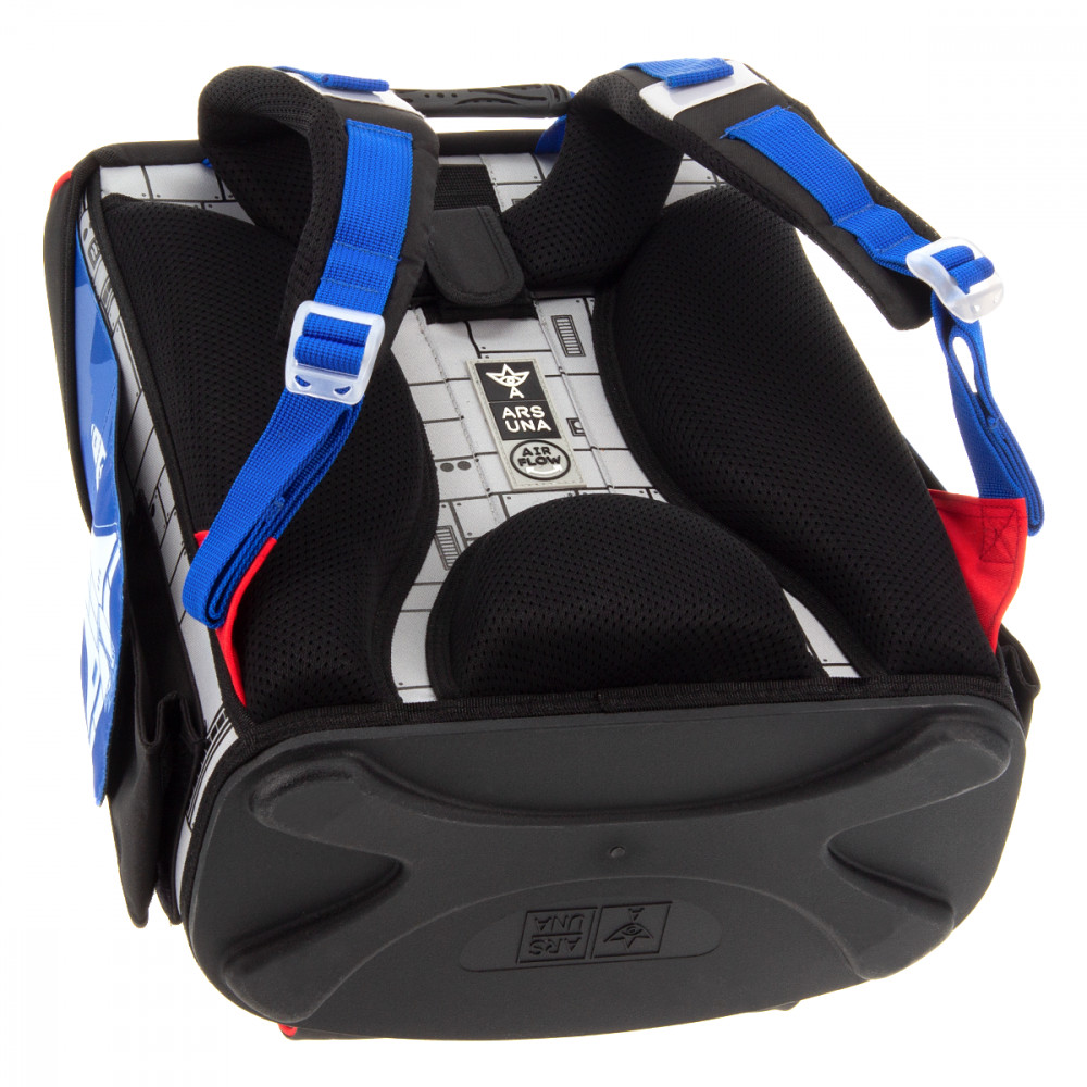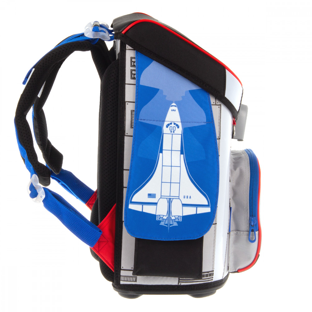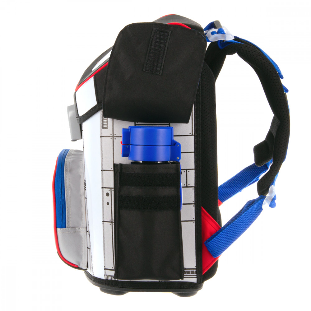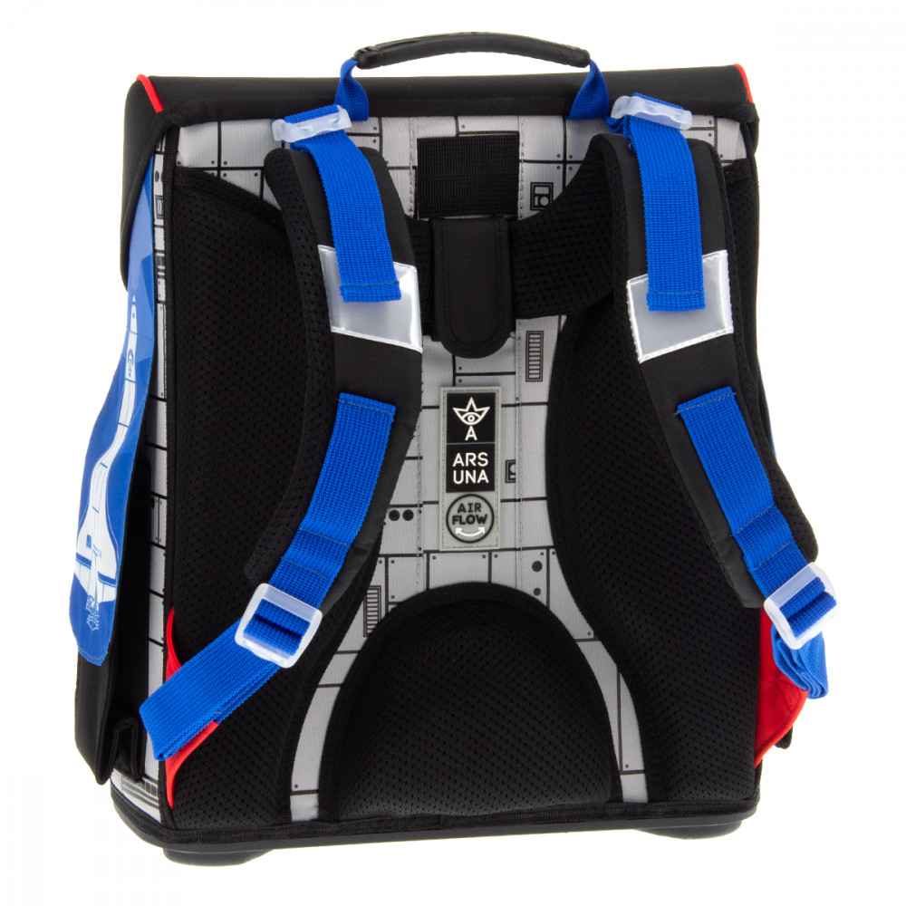 Hátizsák formájú iskolatáska. Könnyű súlyú, formatartó szerkezetű, vízlepergető anyagból. Gerinckímélő, vastagon párnázott, merevített, ergonómikus hátkiképzéssel. Puha, méretre állítható vállpántokkal és plusz állítható pántokkal, amelyekekkel szabályozható, hogy mennyire álljon feszesen a gyerek hátához simulva a táska. Alja tartós kemény műanyag. Nagy felületű fényvisszaverő elemekkel elől, oldalt és a vállpántokon. Felülről könnyen pakolható, teteje FIDLOCK mágneszárral záródik. Belsejében egy textil elválasztó elemmel, két nagy rekesszel. A táska tetején belül átlátszó műanyag órarendtartóval és órarenddel. Oldalán két zsebbel a kulacs részére, elején egy cipzáros zseb az uzsonnás doboz részére. Tetején műanyag fogantyúval. Mérete: 330x410x240 mm. Súlya: 1.1 kg. Táska űrtartalma: 18 l. Terhelhetőség: 12 kg. 3 év garancia.