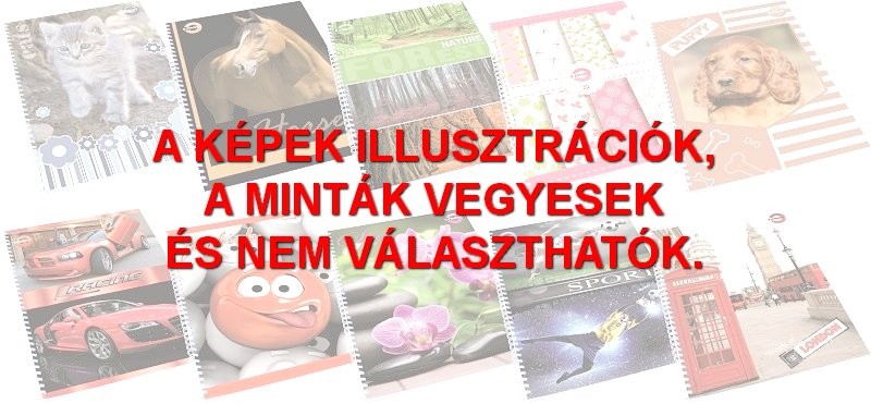 A/5-ös méretű, vonalas spirálfüzet, 10 különböző mintával. Dupla spirálozás, mely egyrészről stabilitást ad a füzetnek, másrészről hosszú élettartamot biztosít, mert a zárt spirálnak köszönhetően az nem sérül. 275 g-os borítója fényes fóliával bevont, ami időtállóvá teszi. Hófehér ofszet belívei a magyar szabványnak megfelelő vonalazásúak.