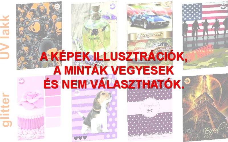 34 lapos, A/5-ös tűzött iskolai füzet, 4 különböző mintával. Magyar szabványnak megfelelő, kék színű vonalazással (21-32) ellátott, vonalas hófehér füzetlapok. Extra alapanyagok és felületkezelés: 70 g-os magas minőségű hófehér füzetlapok, vastag 250 g-os borító alapanyag. A füzet design-nak megfelelően kialakított felületkezelés: érdes felületű matt fólia, melynek egyesrészei formalakkozva vannak!