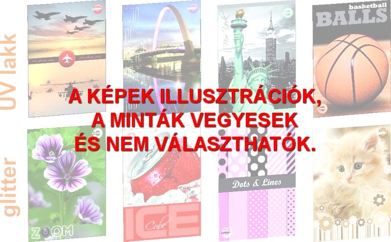 34 lapos, A/5-ös tűzött iskolai füzet, 4 különböző mintával. Magyar szabványnak megfelelő, kék színű vonalazással (27-32) ellátott, négyzetrácsos hófehér füzetlapok. Extra alapanyagok és felületkezelés: 70 g-os magas minőségű hófehér füzetlapok, vastag 250 g-os borító alapanyag. A füzet design-nak megfelelően kialakított felületkezelés: érdes felületű matt fólia, melynek egyesrészei formalakkozva vannak!