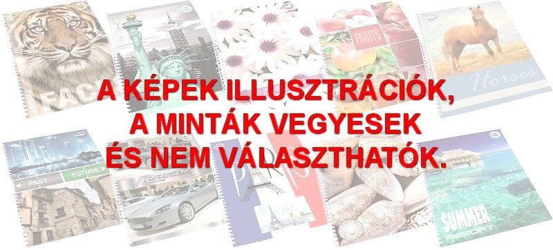 A/4-es méretű, sima spirálfüzet, 10 különböző mintával. Dupla spirálozás, mely egyrészről stabilitást ad a füzetnek, másrészről hosszú élettartamot biztosít, mert a zárt spirálnak köszönhetően az nem sérül. 275 g-os borítója fényes fóliával bevont, ami időtállóvá teszi. Hófehér ofszet belívek.