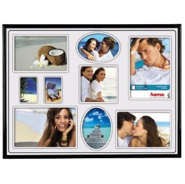 Műanyag keret, 9 db fotóhoz (2x 9x13 cm, 2x 10x15 cm, 2x 7x10 cm ovalis, 1x 9x9 cm és 2x igazolványkép)