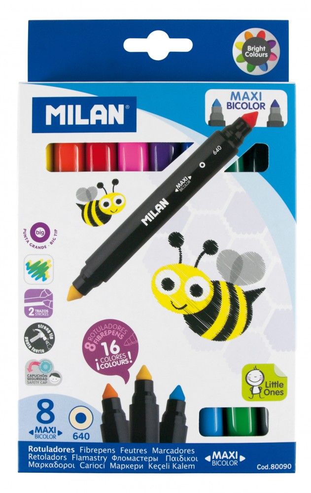 8-as (80090) hengeres testű, kétvégű (Bicolour) filctoll (640) készlet, vízbázisú festékkel töltve. A filcek két vége különböző színű, ezáltal a 8 filctollal 16 különböző színt lehet rajzolni. Vastag (maxi), kúpos csúcs melynek csúcsa vékony vonalak (0,75 mm) rajzolására alkalmas, míg a csúcs oldalával (5 mm) nagyobb felületek is könnyen satírozhatók. Élénk színű festékei egymással keverhetők és toxikus anyagot nem tartalmaznak. Lélegző (ventilációs), biztonsági kupakjának köszönhetően megvéd a fulladástól a kupak esetleges lenyelése esetén is. Karton doboza méhecskés mintával díszített és egyedi zárószerkezetének köszönheteően könnyen nyitható és zárható.