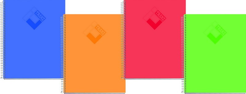 Kemény polipropilén fed- és hátlap . 70 g-os, hófehér ofszet belívek. Mikroperforált és lyukasztott lapok (4 lyuk). Visszaforduló spirálozás