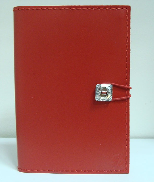Piros bőr naptár Swarovski kristállyal díszítve, cserélhető betéttel, napi beosztású. Méret: 10x14,5 cm.